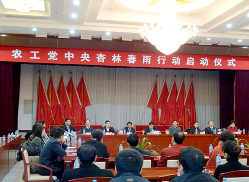 圖為2012年1月8日“杏林春雨行動——農工黨推動醫(yī)藥衛(wèi)生事業(yè)發(fā)展項目”啟動儀式在京舉行,通過宣傳普及中醫(yī)藥文化和科學、推廣使用中醫(yī)藥適用技術、總結交流中醫(yī)藥學術經驗,從而推動我國醫(yī)藥衛(wèi)生事業(yè)的發(fā)展,推動中醫(yī)藥事業(yè)的振興和發(fā)展