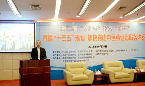 圖為2015年10月20日,農工黨上海市委會等共同主辦的第二期文匯中醫(yī)藥文化講堂開講,聚焦健康服務業(yè)與中醫(yī)藥發(fā)展契機。農工黨中央副主席蔡威出席并講話