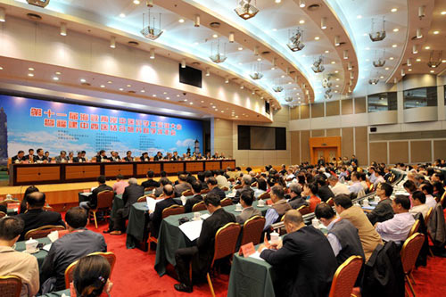 圖為2014年11月8日,第十一屆海峽兩岸中醫(yī)藥學術交流大會在福建省福州市開幕。400余位來自海峽兩岸中醫(yī)藥專家、學者及外國來賓歡聚一堂,共商弘揚中醫(yī)藥文化大計。本次大會由中國中醫(yī)藥研究促進會等共同主辦,臺灣中華中醫(yī)藥學會等8家單位協(xié)辦