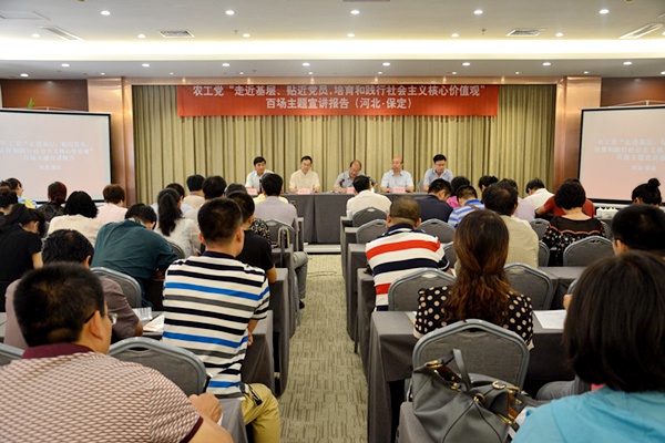 圖為農工黨“走進基層,貼近黨員,培育和踐行社會主義核心價值觀百場主題宣講”走進河北省保定市,圖為農工黨黨員曹東義作題為《優(yōu)秀中華文化,成就科學中醫(yī)》的宣講