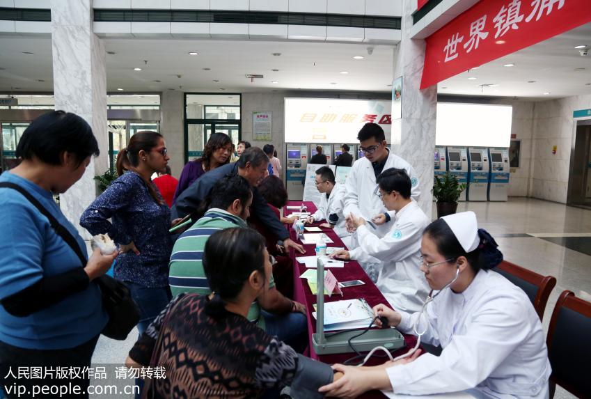 10月17日上午,紹興市中心醫(yī)院疼痛科聯(lián)合麻醉科在醫(yī)院門診大廳舉辦了大型義診公益活動。(單明銘/人民圖片)