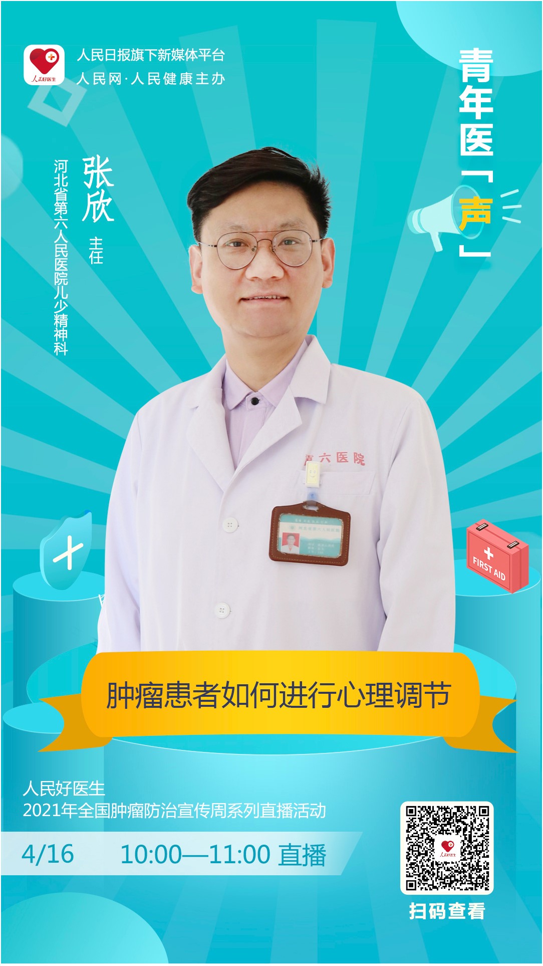 4月16日10:00-11:00人民日報社旗下新媒體“人民好醫(yī)生”客戶端將邀請河北省精神衛(wèi)生中心心理救援隊副隊長、河北省第六人民醫(yī)院兒少精神科主任 張欣做客“青年醫(yī)‘聲’”欄目,為大家講解腫瘤患者該如何進行心理調(diào)節(jié),患者家屬該如何配合醫(yī)生進行心理治療,千萬不要錯過。