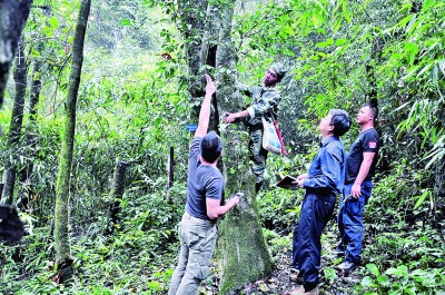 科研人員在考察西雙版納勐海大黑山古茶樹。 光明圖片