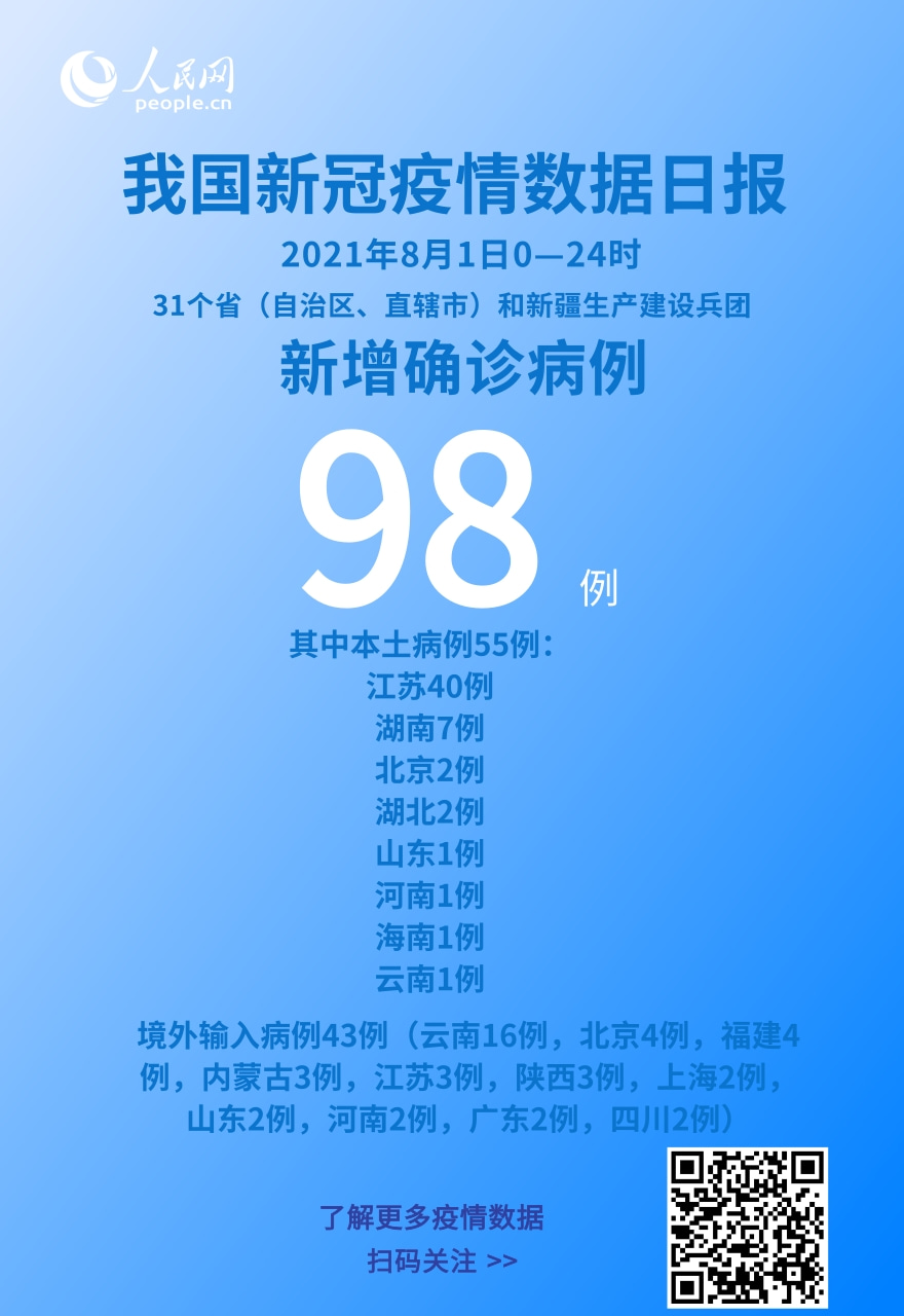 人民網(wǎng)北京8月2日電 (記者崔元苑)今日,國(guó)家衛(wèi)生健康委于官網(wǎng)發(fā)布了截至8月1日24時(shí)新型冠狀病毒肺炎疫情最新情況。8月1日0—24時(shí),31個(gè)。ㄗ灾螀^(qū)、直轄市)和新疆生產(chǎn)建設(shè)兵團(tuán)報(bào)告新增確診病例98例,其中境外輸入病例43例(云南16例,北京4例,福建4例,內(nèi)蒙古3例,江蘇3例,陜西3例,上海2例,山東2例,河南2例,廣東2例,四川2例),本土病例55例(江蘇40例,湖南7例,北京2例,湖北2例,山東1例,河南1例,海南1例,云南1例);無(wú)新增死亡病例;無(wú)新增疑似病例。