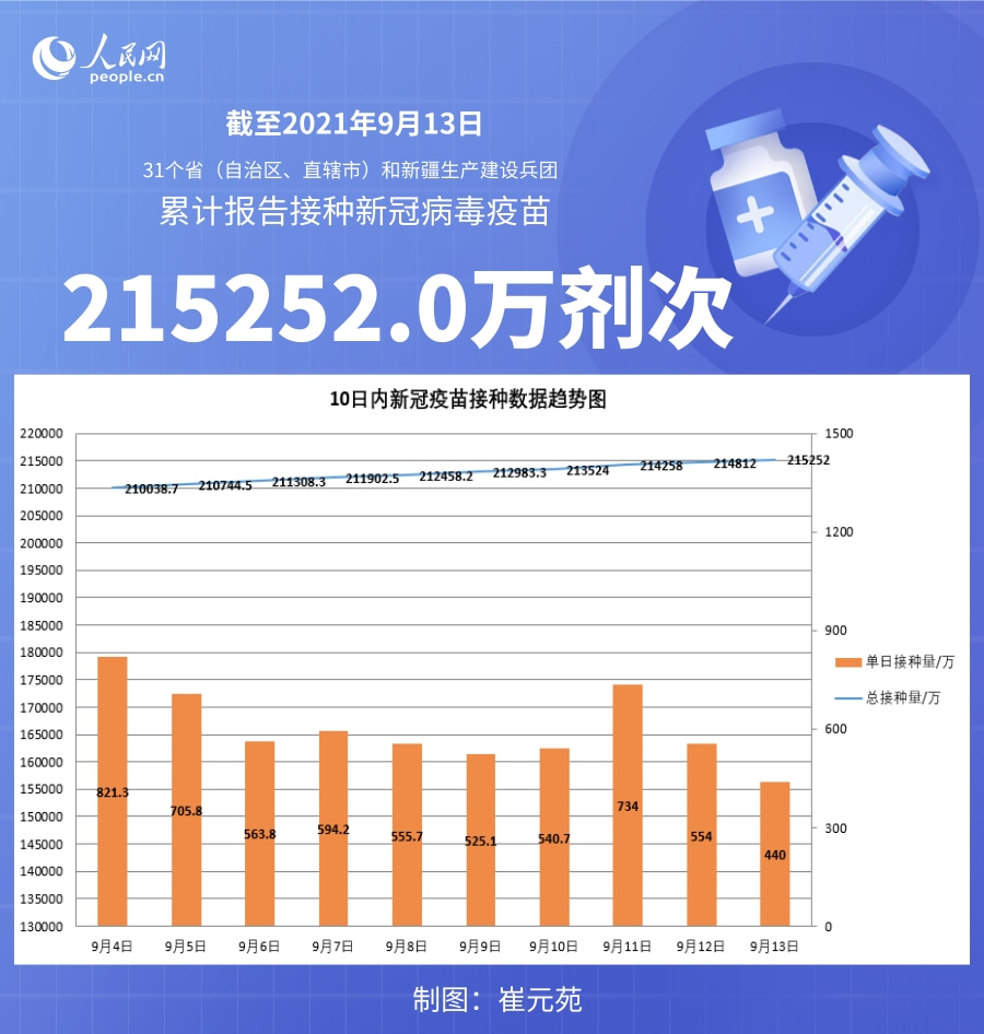 人民網(wǎng)北京9月14日電 (記者崔元苑)據(jù)國(guó)家衛(wèi)生健康委官網(wǎng)消息,截至2021年9月13日,31個(gè)。ㄗ灾螀^(qū)、直轄市)和新疆生產(chǎn)建設(shè)兵團(tuán)累計(jì)報(bào)告接種新冠病毒疫苗215252.0萬(wàn)劑次。