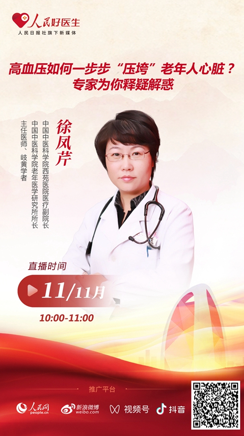 11月11日10:00,中國(guó)中醫(yī)科學(xué)院西苑醫(yī)院醫(yī)療副院長(zhǎng)、中國(guó)中醫(yī)科學(xué)院老年醫(yī)學(xué)研究所所長(zhǎng)、主任醫(yī)師、岐黃學(xué)者徐鳳芹將做客“人民好醫(yī)生”客戶端直播間,向廣大網(wǎng)友分享老年高血壓相關(guān)知識(shí),歡迎屆時(shí)收看。