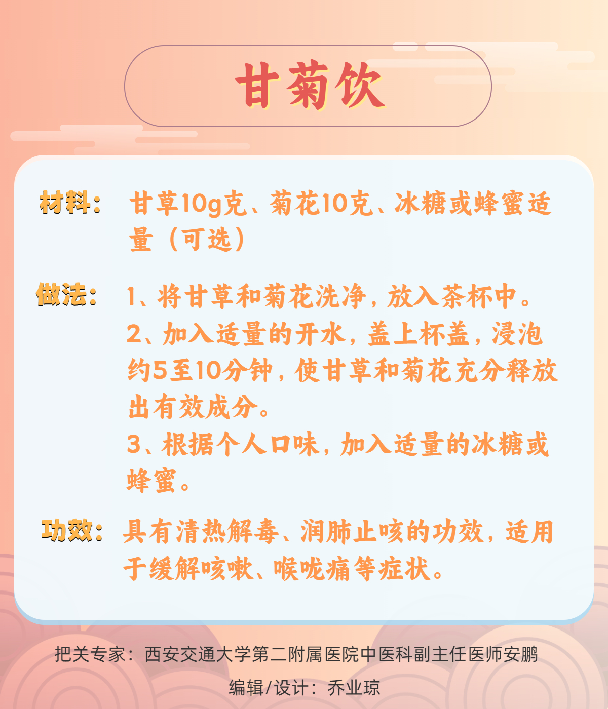 人民網(wǎng)北京2月4日電 (記者喬業(yè)瓊)最近不少網(wǎng)友反映,感染呼吸道疾病恢復(fù)之后仍然咳嗽不止,尤其是接觸了冷空氣、刺激性氣味、煙霧等,更容易引起咳嗽,影響日常生活。對(duì)此,西安交通大學(xué)第二附屬醫(yī)院中醫(yī)科副主任醫(yī)師安鵬根據(jù)不同情況,對(duì)應(yīng)推薦6款中藥茶飲,以緩解咳嗽的癥狀。